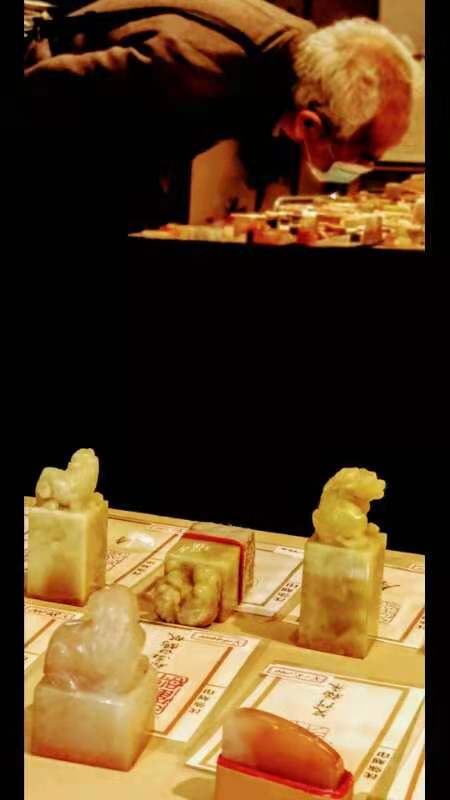 在每次的展览会上,都会出现一位瘦々的年长者,象个老学究,他每次来总要呆近二个小时,什么话也不说,却会在每一方印前仔细长看,不时发出赞叹声,最后也总是会购选他所喜爱的印高兴地回家。足见其对沈强所刻印的喜爱。