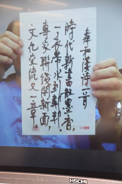 成都会场的方北辰立即挥毫《奉和汉诗一首》,回赠早川太基:“时代新书散墨香,一衣带水到邻邦。专家连线开新面,文化交流又一章。”