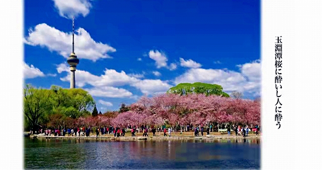 从3月25日起,北京最大赏樱地--玉渊潭公园樱花文化节活动正式开幕,而这幅作品和俳句,创作于今年的4月3日,正是樱花盛开时,花醉人醉,花美人过,绿潭照影,诗意与景色两镜相入,圆融无碍。