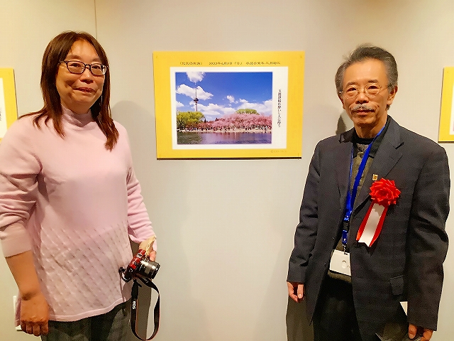 如在出展作品中表现玉渊潭樱花的照片,用光柔和明丽,在蓝天、白云、绿树的三重背景下,表现了如烟如雾,淡粉深红的樱花盛开和赏花的人们川流不息的景色,而配合这幅作品的俳句是这样写的:“玉渊潭 樱花盛开 醉花又醉人”(玉淵潭 桜に酔いし人に酔う)。