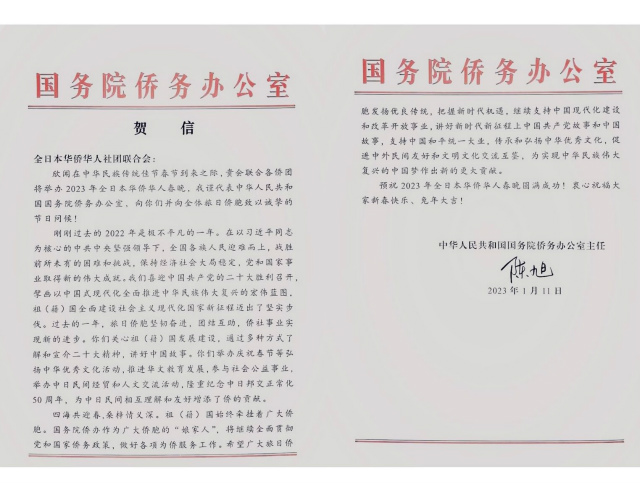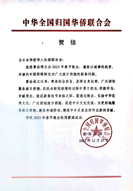 贺信为全华联主办的 《2023年华侨华人春节晚会》送来了热情的祝贺,并请全华联转达对广大旅日侨胞的新春问候。