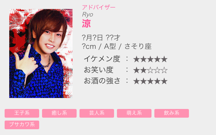 日本人喜欢量化数据,在牛郎店的官网上,评价标准除了“帅气度”外通常还包括“幽默感”和“酒量”等。丑八怪也敢于给自己打上“治愈系”“丑帅系”“可爱系”这样的标签。