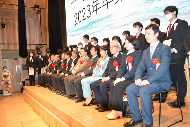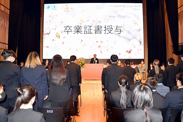 中华人民共和国驻日本国大使馆公使参事官兼总领事陈巍、中华人民共和国驻日本国大使馆领事部领事王宝锋、中华人民共和国驻日本国大使馆领事部领事董丹丹、原参议院议员、原外务大臣/总务大臣政务官浜田和幸、东京华侨总会会长陈隆进、丰岛区日本中国友好协会会长尾崎隆信、立教大学社会学部学部长水上彻男、株式会社 ラズワルド 代表取缔役小林良晴、日本私立大学协会教育学术新闻记者野口和久、千代田国际语学院理事长栗田平顺、千代田教育集团会长栗田秀子等嘉宾参加了毕业式。