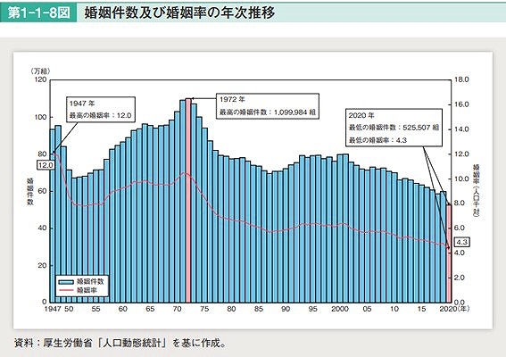 日本的少子化是各个老生常谈的问题,想要合法拥有后代(生孩子),结婚是前提条件。但就目前来说,日本国内的结婚率也在下降,种种迹象表明,经济原因与职业女性增加是背后的主要推手。