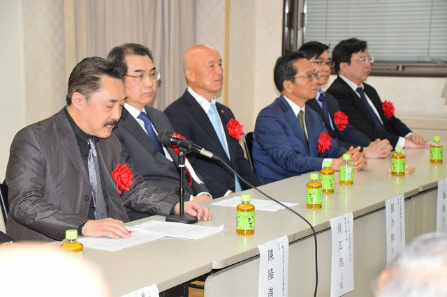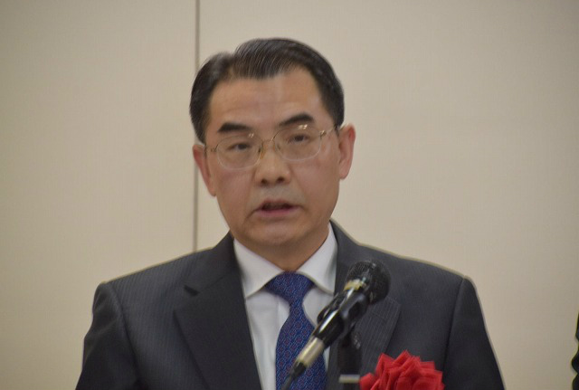 陈隆进会长致欢迎词时说:今年东京的樱花比往年早6天,再过一周就会迎来樱花满开的日子。在如此樱花盛开的时候,我们迎来中华人民共和国第十三任驻日大使吴江浩履新,并来到华侨总会,我们感到非常光荣,表示热烈欢迎。陈隆进会长还回忆了东京华侨总会从中日邦交正常化以前就致力推动中日民间交流的历史,以及邦交正常化之后与使馆和历任大使的交流,期待吴江浩信任大使能推动中日间的进一步交流与合作。