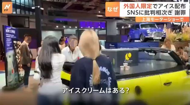 事情说来也简单,宝马mini的展台免费给参观者发放冰淇淋。一个中国小姐姐看到后就去问:“还有冰激凌吗?”,结果被告知已经发完了,是限量发放的。小姐姐听后就离开了。