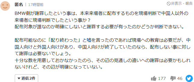 如果明明可以分发却撒谎说“分发结束了”的话,给些教训是必要的。还有面向中国人和面向外国人的问题,如果面向中国人的已经结束了的话,对于不分发的事情不需要道歉吧?如果没有准备足够的数量,也许有必要对这方面的预测不同进行道歉,但这些信息没有明确来讲。