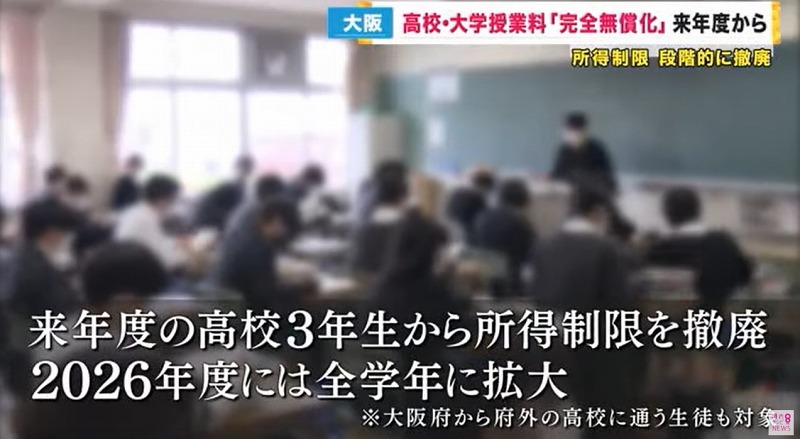 报道指,从2024年起大阪府将取消高中三年级学生家庭的收入限制,到2026年时扩展到所有年级,并且在其他都道府县就读高中的大阪学生也有资格免学费。据大阪府表示,大阪是日本第一个实现高中教育完全免费的都道府县。