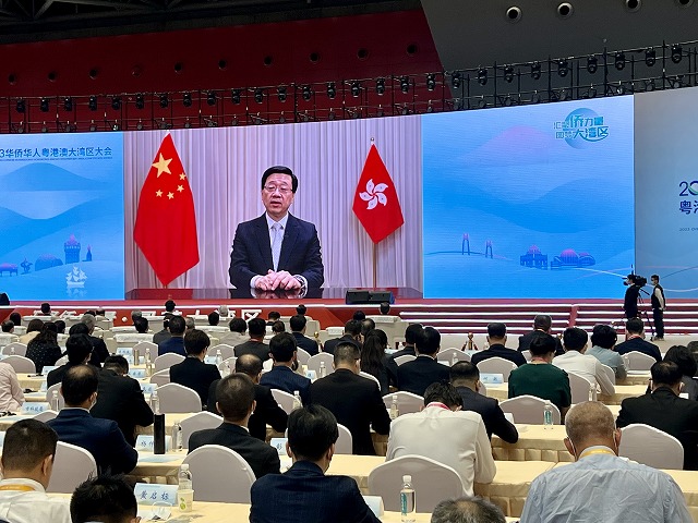 中文导报讯 5月17日,2023华侨华人粤港澳大湾区大会在广东江门珠西国际会展中心开幕。来自海内外侨界精英、嘉宾代表欢聚一堂,共叙乡情,共谋发展。中共中央政治局委员、广东省委书记黄坤明发表了主旨演讲,香港特首李家超、澳门特首贺一诚发表了视频致辞,中央统战部副部长、国侨办主任陈旭发表了讲话。华侨华人代表致辞,港澳和广东九大都市向全球华侨华人做了发布推广。