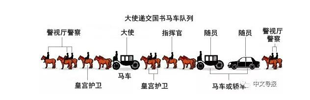 据了解,马车列队由警官骑士队开路,以每小时10公里的速度朝着皇宫前进。两名皇宫骑警跟随大使马车,骑着白马的指挥官紧随其后。