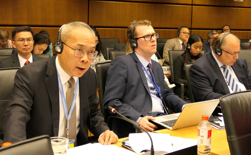 6月5日,中国国家原子能机构主任、国际原子能机构理事会中国理事张克俭在维也纳出席国际原子能机构六月理事会,抨击日本排放福岛核污染水计划。针对日方说辞,中国常驻国际原子能机构代表李松行使答辩权,予以批驳。图为李松(左一)发言。