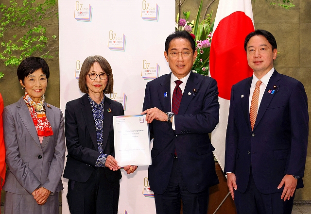 5月8日,岸田首相接受七国集团(G7)性别平等咨询委员会(GEAC)的建议书。来源:首相官邸网页
