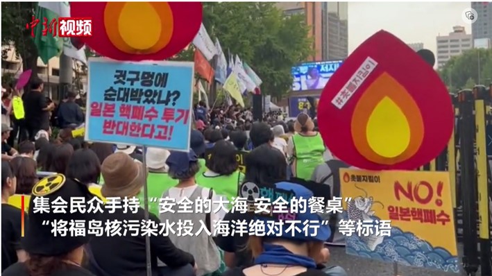 当地时间8月12日下午,大批韩国民众在首尔市中心广场集会,谴责日本核污染水排海计划。来自中新网视频截频 (记者 刘旭 制作 乐小敏)。