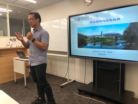 他首先讲到、温州大学的校园有着美丽的人文环境风景,图书馆就建在风水画一样的氛围里,欢迎大家有机会去温州大学参访。然后进入正题说道:华文文学是当今世界最大的语种文学,较之英语文学、法语文学、俄语文学、德语文学、西班牙语文学、日语文学等,在世界上拥有更广泛的读者。