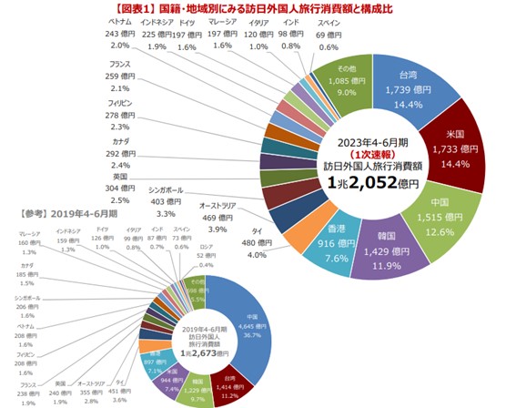 据日本观光厅发表的最新数据,2023年4月至6月季度外国游客赴日旅游消费预计为120,52亿日元(2019年同期的95.1%)。 按国籍/地区划分,台湾地区最大,为1,739亿日元(构成比14.4%),其次是美国,为1,733亿日元(同比增长 14.4%)、中国 1,515 亿日元(同比增长 12.6%)、韩国 1,429 亿日元(同比增长 11.9%)。