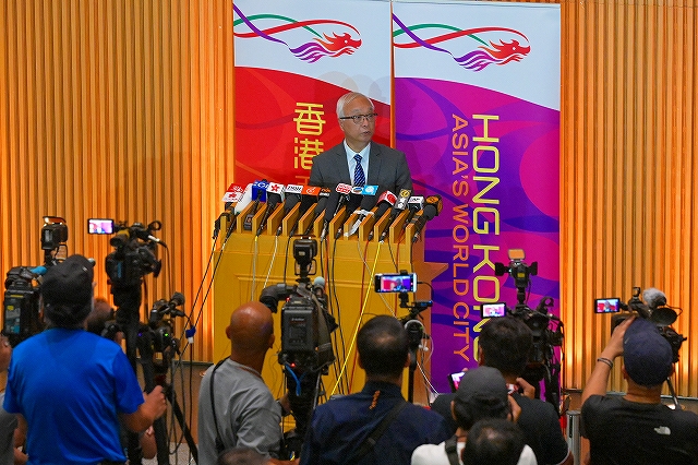8月22日,香港特区政府环境及生态局局长谢展寰会见传媒时表示,因应日本福岛核污染水排放计划,由8月24日起,香港将禁止源自东京、福岛、千叶、栃木、茨城、群马、宫城、新潟、长野和埼玉10个都县的水产品进口。 中新社记者 陈永诺 摄