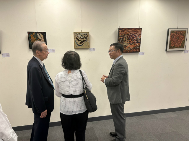 10月3日,日本前首相福田康夫参观漆艺交流展并与“漆艺体验教室”闽江学院教授周榕清亲切交谈,提出非常欢迎主办方在东京举办漆艺交流展,期待通过更多传统文化的交流,促进国家之间和平与发展。(图/文:中国文化中心)