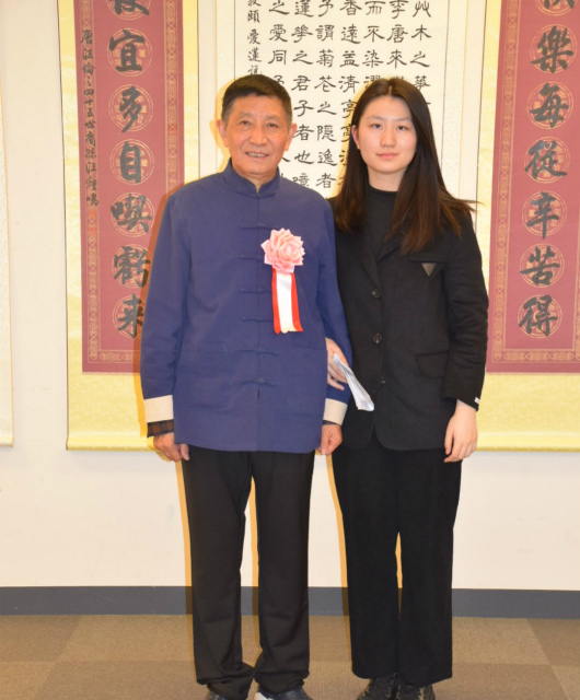 日中协会理事长濑野清水用中文致辞,对作品展的圆满举行,汪钟鸣携孙女汪曦凝共同出展表示祝贺,他引用《礼记》中“六十杖于乡,七十杖于国,八十杖于朝”的话风趣地说,汪钟鸣先生去年于故宫办展,提前十年实现“杖于朝”的这一人生盛事。