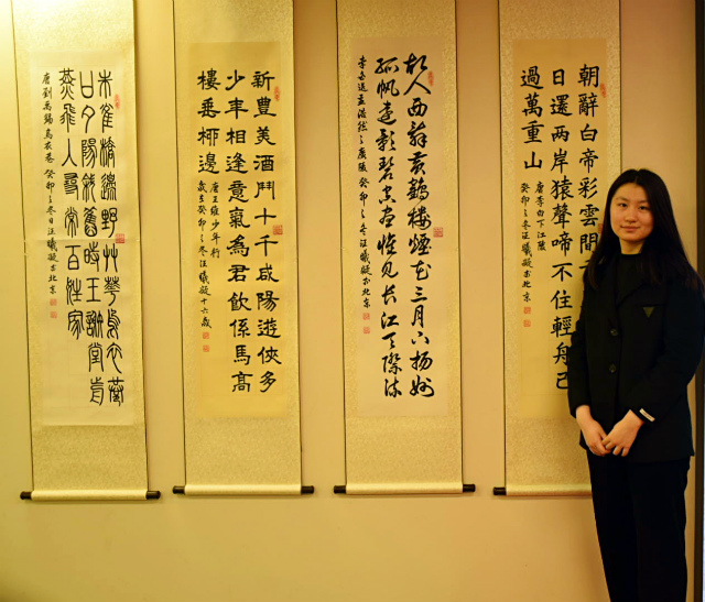 汪钟鸣孙女、少年书法家汪曦凝在开幕式上用中英文致辞,她表示,我非常荣幸能来到今天的现场,这是我首次作为出展书法家与爷爷一起出展,也是第二次公开我的作品。这次展出对我来说既是机会也是挑战,而我不变的初心是传播中国传统文化,传播文化的魅力,我也希望今天在场的嘉宾可以感受到中国书法的独特力量,正如古人所说:“言为心声,书为心画”(扬雄语)。