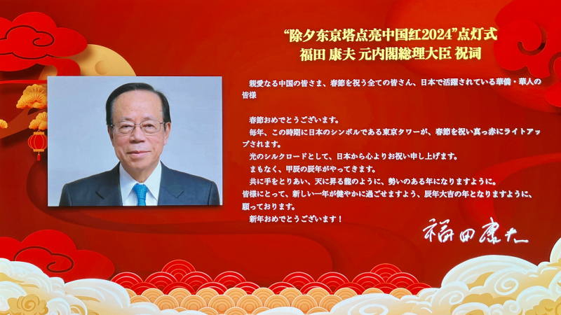 福田康夫前首相向全球华人表达了新春祝福,祝愿中日两国人民关系能够像升腾的飞龙一样,携手并进,共同迎接甲辰龙年。