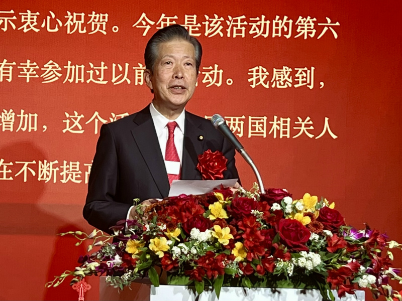 日本执政党公明党代表山口那津男在致辞中表示,今年是该活动的第六次举办。随着举办次数的增加,这个活动在中日两国相关人士中的知名度也在不断提高。期待着未来能多举办有类似这样的庆祝春节活动,以及其他能够促进两国人民愉快地交流的活动。今年是龙年,相传我们将被腾云驾雾的龙所保佑,我衷心希望中日关系也能得到龙腾虎跃龙般的强劲发展。