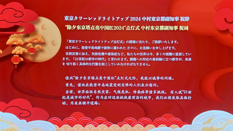 第六回“东京塔点亮中国红”,于2月9日除夕夜在东京塔38层展望台举行了点灯仪式。中国驻日大使吴江浩、公明党代表山口那津男出席仪式并致辞。现场发布了国务院侨办主任陈旭、日本首相岸田文雄、日本原首相福田康夫的祝贺信息。实行委员会委员长颜安和嘉宾们一起点灯,举行镜开仪式,共同举杯庆祝新春佳节。中日友人和嘉宾欢聚一堂,见证了东京塔第六次点亮中国红,共同迎接龙年春节到来。