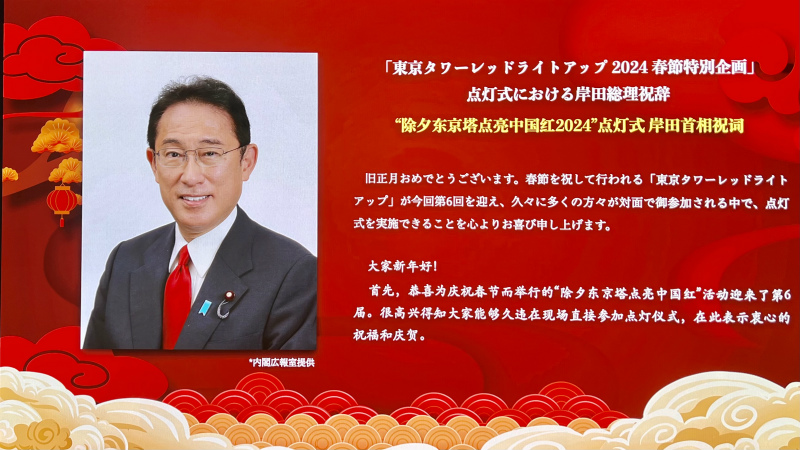 岸田文雄在祝词中表示,作为日本首都东京的象征东京塔,它发出的光芒具有特殊含义。今晚农历除夕夜点起的,在中国意味着吉祥的“中国红”,是代表了在跨年之际来自日本的祝福。希望广大日中两国民众共享祝福,也期待两国的交流进一步加深。在这新的龙年里,期待日中关系如同登龙一般更加强壮飞腾,祝愿两国人民幸福安康。