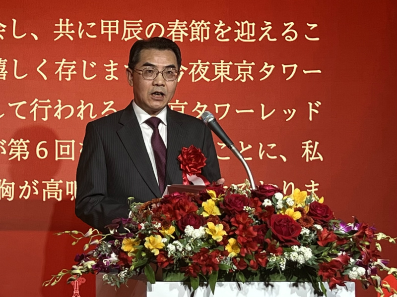 在点灯仪式上,中国驻日本大使吴江浩致辞。吴江浩在致辞中送上了三句祝福,一是祝愿祖国更加繁荣昌盛,二是祝愿中日关系得到改善和发展,三是祝愿在日华侨华人更加健康幸福。吴江浩表示,衷心祝愿今晚东京塔的“中国红”能给大家带来温暖和力量,衷心祝愿各位同胞朋友在新的一年里发展更加顺利,幸福安康。
