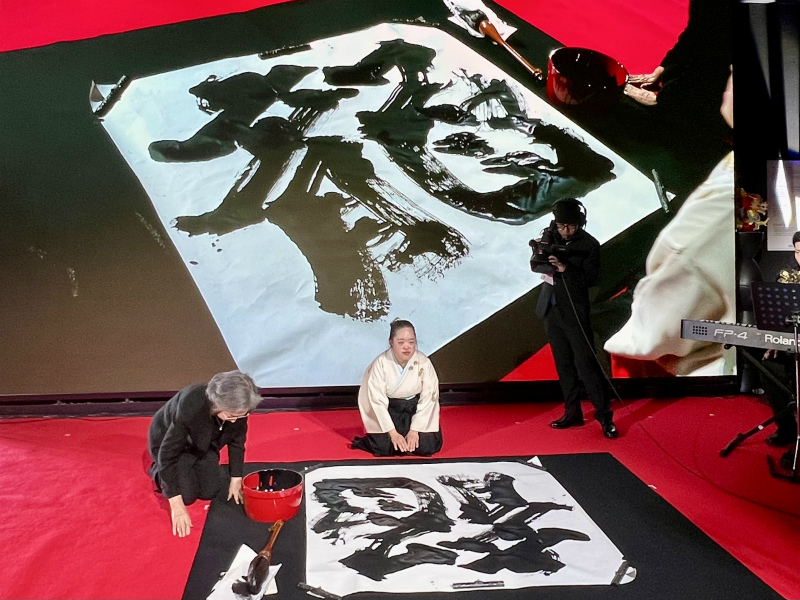 日本书法表演艺术家金泽翔子和音乐家Yoshio合作表演了书法节目《龙》。