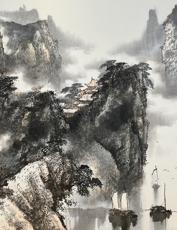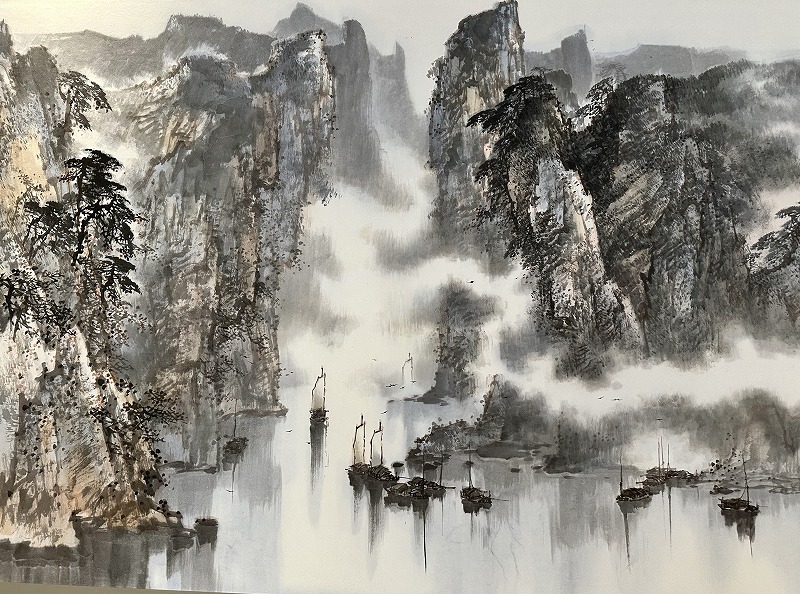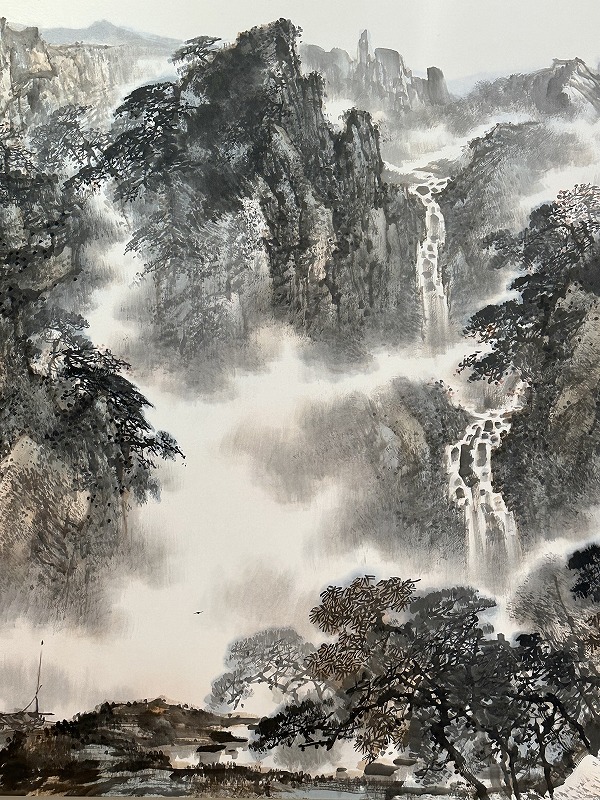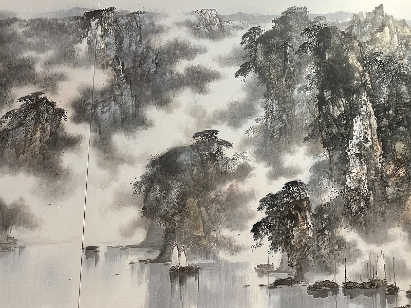 巨幅山水画可以远观,还可近看。细节也精湛动人。