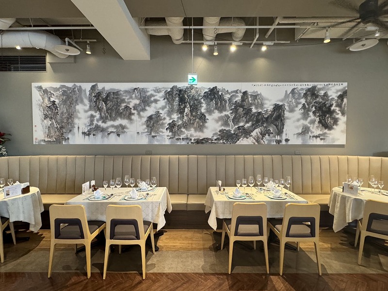 刘岩是一位能干踏实的实业家,也是一位充满艺术感性品味的女士。她说这幅画像窗,十分贴切,客人坐在店里吃饭,抬头见画,山峰叠翠,流水依依,空气便也灵动起来。