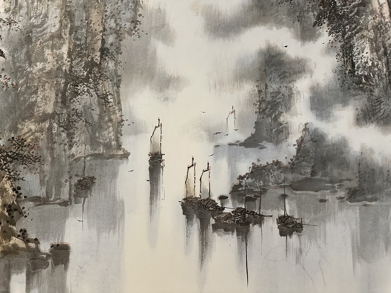王子江说,在接到全聚德的作画希望时,他潜心构思,从与建筑物和周边的协调入手创作,而且地处六本木的全聚德本是国际化的所在,因此这幅画没有以富贵牡丹等通常意义上的中国元素为主题,而是以能让来吃饭的客人欣赏、交流的角度,绘制出这幅彩墨画——“瑞气烟岚秀 祥舟碧水间”,这是王子江为自己倾心创作的这幅画作取名,也真正贴切地展现了画里神韵。
