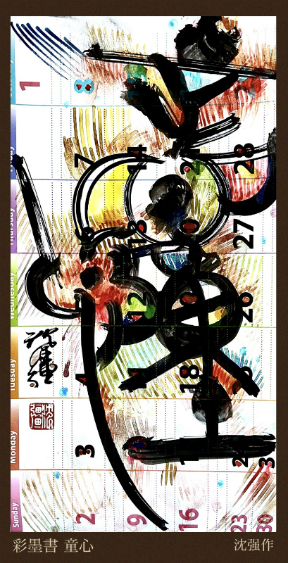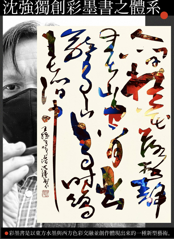 彩墨书法是沈强在1993年首创。其时他刚从日本学艺大学大学院岀来,在习艺的同时,他总想要在学习中国传统书法的根基上,再走出一条与他人不同的属于自己的路。他很淸楚艺术如果沒有自己的想法去创意创新,一味跟着他人走,则始终会跟不上时代的发展與需求。由于沈强自小在学习书法的同时,也兼习美术,并受到了很好的系统训练,故对西洋美术尤其是造型构成色彩等抱有浓厚的兴趣,这些都为他后来的彩墨书法创作添铺了有利条件。