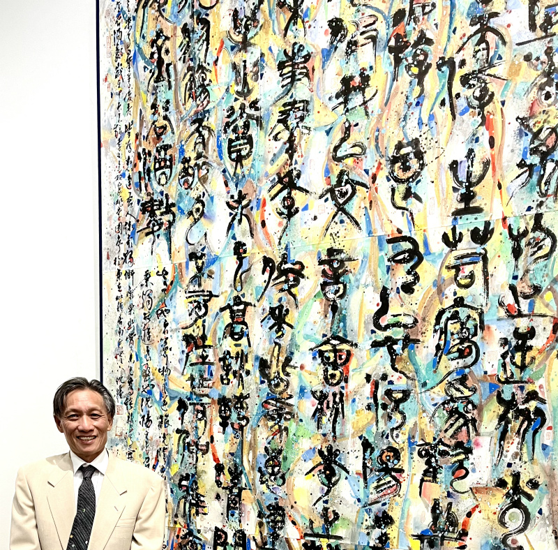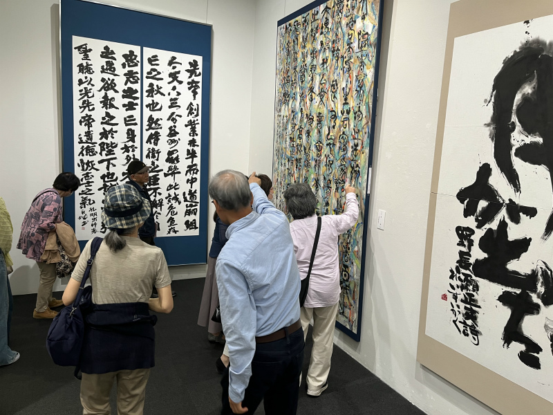 中文导报讯 一幅引人注目的高3米宽2米的彩墨书法大作于4月20日~24日在上野的森美术馆与其他70位日本书家的大作同時展出。吸引了众多书法爱好者驻足观赏和兴趣。在众多的以黑白为主的书法作品中,这幅与众不同独特的作品出自在日华人书画篆刻家沈强之手。这也是沈强首次以彩墨书大作形式亮相。由此也说明了由其独创的彩墨书被日本书道界所认可,受到观众的喜爱。