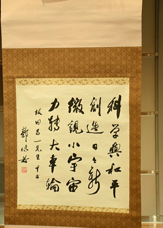 坂田文彦在致辞中指出:我的父亲坂田昌一第一次见到郭沫若先生是在 1955 年秋天,当时他作为中国科学院代表团团长来到日本。 1956 年春,父亲应郭沫若先生在莫斯科逗留期间发出的邀请,在没有外交关系的中国,并没有在中国有效的护照及签证的情况下,去北京逗留了约四周时间。 后来,在东西冷战日益紧张的情况下,父亲克服重重困难,在 1964 年北部湾事件后立即举行的北京科学讨论会和1966 年北京夏季物理讨论会上,参与和促进了中日科学家之间的研究交流。而在1967年前后,发现了我父亲患上了一种不治之症--多发性骨髓瘤。这与中国即将面临文革的困境的时间不谋而合。 我第一次了解到郭沫若先生在中国困难局势中对我父亲的温暖的对应,是在读到郭沫若先生的女儿郭平英女士写的《郭平英回忆录》时,郭沫若先生将中药处方寄往日本,试图缓解我父亲的病情。 父亲去世两年后的 1972 年,日中两国恢复邦交正常化,学术和经济交流进入活跃期。我自己也是为了与中国进行科学方面进行共同研究,从1985年后共访问了30次以上中国。
