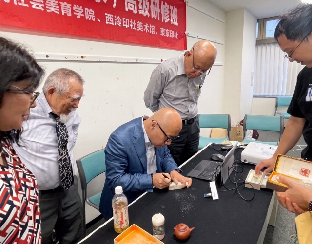 2024年5月27日到5月31日,在东京荣丰斋举办书法篆刻艺术高研班如期开班。该班旨在推广中国传统文化,让学习者在短期内学习传统书法篆刻技法,多位国内知名艺术家从中国来日参展并授课。主办“书法篆刻(东京)高研班”的三家单位(中国美术学院社会美育学院、中日金石篆刻协会、东京印社)还在“襟吴带泠—篆刻和印钮雕刻国际交流展”的开幕式上签订“多方友好合作框架协议”,不定期的在日本各地开展“社会美育的研学活动”以实际行动来开展“人文交流、文化交流和民心相通,推动民间多层次的文化交流的新局面。