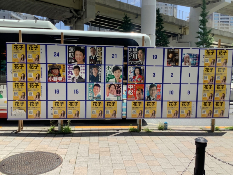 东京都选举管理委员会从5月下旬开始在东京都内各处设置海报看板,考虑到候选人的人数较多,设置了可以张贴48名候选人海报的大型公告板,但最终还是不够。