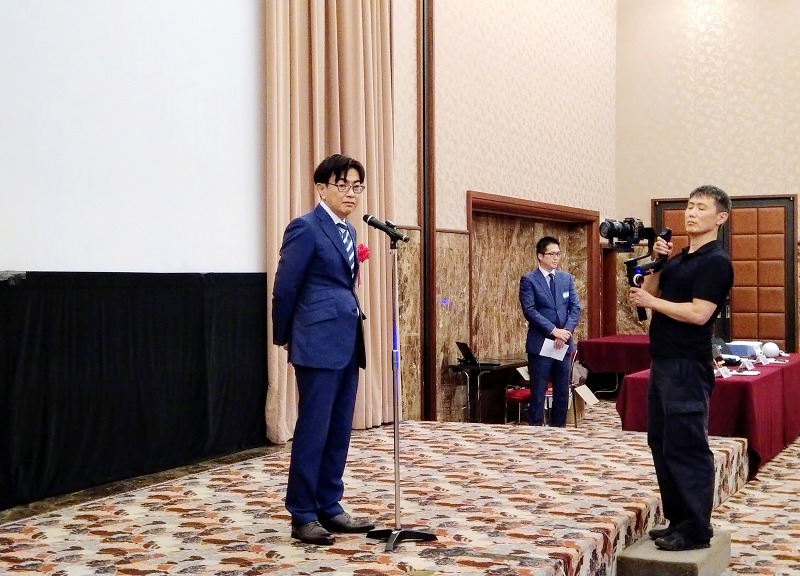 后藤锦隆在致辞中介绍了DENBA JAPAN株式会社的概况,感谢各位嘉宾抽出时间莅临活动,祝贺冈慎之助在巴黎奥运会获得优异成绩,并宣布DENBA Moblie正式发表。