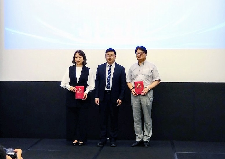 一级调研员孙峰(中)为招才引智大使日本东京理科大学教授赵新为(右)、中国留日同学总会秘书长李勍颁发聘书