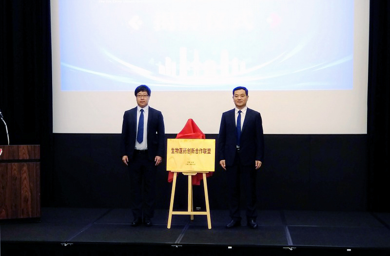 济南市长清区委常委、组织部部长刘振强(右)、中国留日同学总会会长刘恩玺为“生物医药创新合作联盟”揭牌