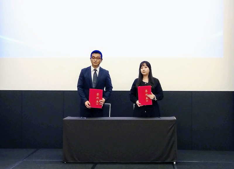 济南市长清区投资促进局局长韩飞(左)与落地项目代表签约