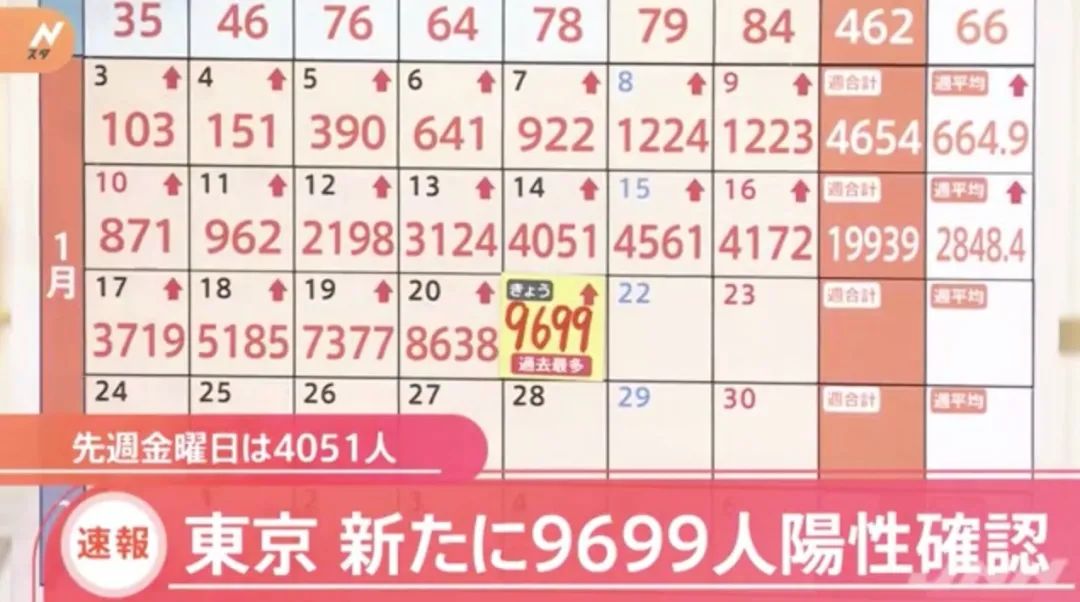 今日,东京一日感染9699人,连续三天破历史新高,比上周五增加一倍以上。