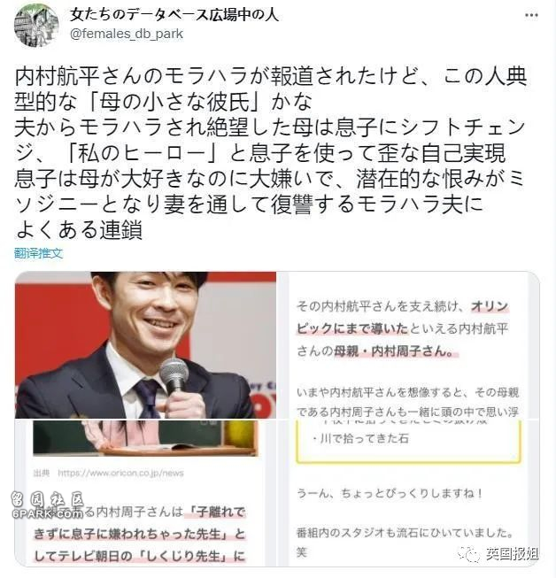 当然,以上基本都是围绕着文春报道中偏向千穗一方的猜想,目前内村航平还没有出面说明,只有他母亲接受了采访,表示对于儿子的情感暴力和离婚骚动并不清楚,“(文春的)报道里那些事,好像是那个人(千穗)的父母说的。”